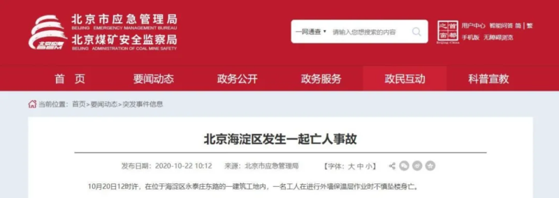 10月20日12时许,在位于海淀区永泰庄东路的一建筑工地内,一名工人在进行外墙保温层作业时不慎坠楼身亡。