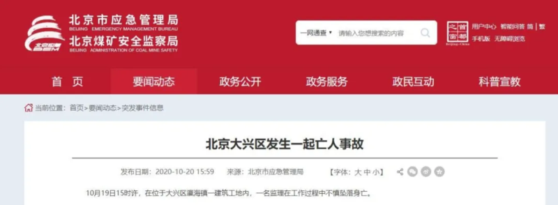 10月19日15时许,在位于大兴区瀛海镇一建筑工地内,一名监理在工作过程中不慎坠落身亡。