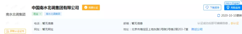 据天眼查,中国南水北调集团有限公司注册地址为北京市海淀区上地东路1号院1号楼2层203-7室。