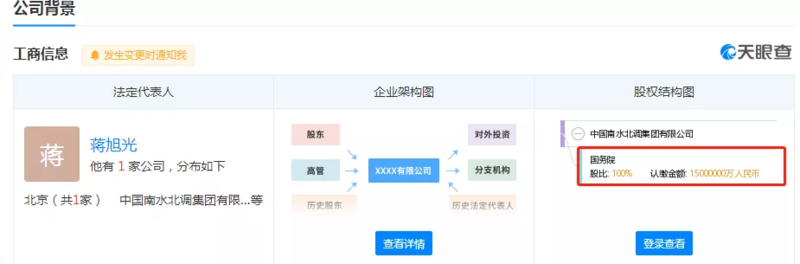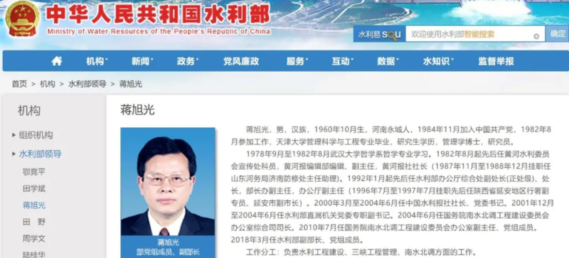 工商信息显示,蒋旭光任中国南水北调集团有限公司董事长。蒋旭光之前担任水利部党组成员、副部长。
