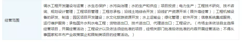 中国南水北调集团的经营范围包括:调水工程开发建设与运营;水生态保护;水污染治理;水的生产和供应;项目投资;电力生产;工程技术研究、技术咨询、规划设计管理;工程项目管理;工程总承包;沿线土地综合开发;沿线矿产资源开采(限外埠经营);工程机械设备的研发、制造;园区项目开发建设;水文化旅游资源开发;水上运输业;绿化管理;软件开发;信息系统集成服务、运行维护服务;承包国外水利水电工程;货物进出口、技术进出口、代理进出口;工程设计。